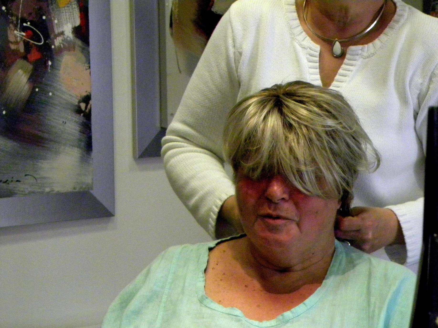 Ma fille Viviane vient d’arriver à Baden pour la semaine, repos bien mérité après son job à Roland Garros. Au programme, choix de ma future perruque chez un coiffeur de Vannes disposant d’un petit rayon spécialisé. Je dois le faire tant que je suis en forme, je ne sais pas comment je vais supporter cette chimio, peut-être serais-je trop fatiguée ou malade. Cet essayage ressemble vite à une séance shopping mère/fille habituelle. No stress. Dans ce salon de coiffure « normal », juste une petite pièce réservée pour essayer les multiples modèles et découvrir des produits de beauté et de maquillage spéciaux chimios. L’accueil y est chaleureux mais très professionnel, l’attitude n’y sera jamais intrusive. Nous discutons de coupe, couleur, rasage de crâne et soins post-chimios. Tout un univers parallèle pour les femmes et les hommes qui à un moment de leur vie vont être différents. Nous avons sélectionné trois modèles puis choisi les couleurs, ils seront livrés la semaine prochaine. Nous programmons immédiatement un second rendez-vous pour le choix définitif.